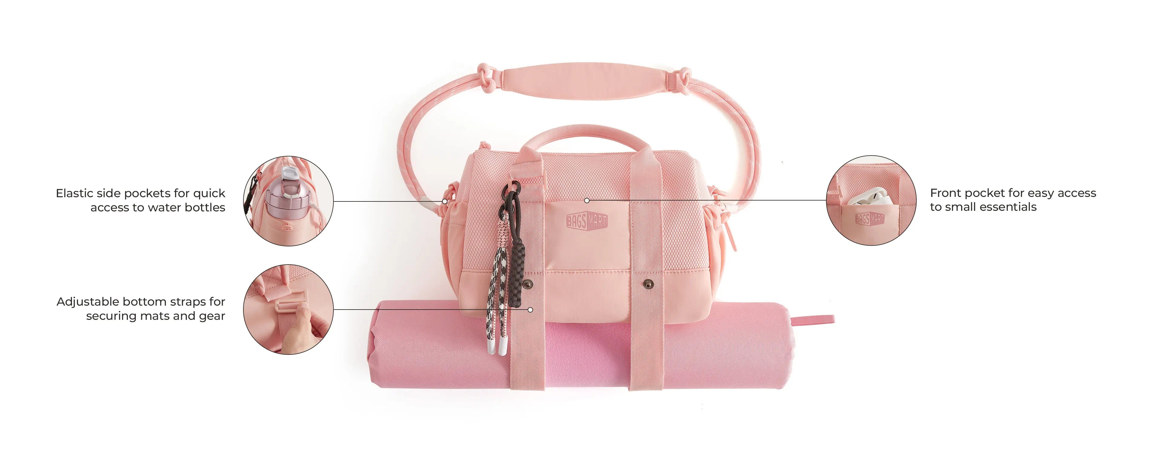 Adjustable bottom straps provide secure storage for mats or fitness gear while maintaining a compact, stylish design. This feature maximizes space without sacrificing portability.